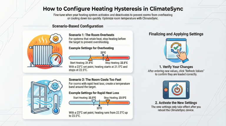 ClimateSync configuration tool to manage on/off hysteresis for various heating systems, such as wet or electric floor heating, radiators, and trench heaters.