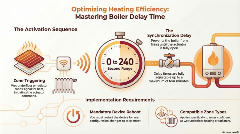 The Boiler Delay function is used to protect the boiler and improve system stability by delaying the boiler activation when heating demand begins.